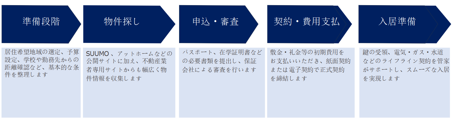 外国人留学生の方でも安心して住まい探しができるよう、5つのステップで丁寧にサポートいたします。